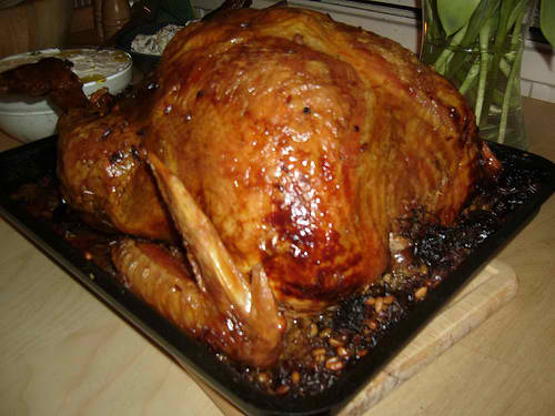 Ξεφλουδίζετε τά κάστανα. Βάζετε σέ κατσαρόλα νερό νά κάψη κα’ι ρίχνετε τά φύλλα τής δάφνης. Μόλις πάρη βράση, ρίχνετε τά κάστανα νά μισοβράσουν (περίπου 25 λεπτά). Στό μεταξύ, βγάζετε τά εντόσθια τής χήνας, τήν καψαλίζετε κα’ι τήν πλένετε μέ καφτό νερό. Τήν άλατοπιπερώνετε. Τήν γεμίζετε μέ τά κάστανα, πού άλατοπιπερώνετε ελαφρά κα’ι τήν ράβετε μέ λευκό σπάγγο. Τήν τοποθετείτε σέ άβουτύρωτο ταψί κα’ι τήν ψήνετε περίπου 2&1/2 ώρες σέ μέτριο φούρνο. Πότε – πότε, προσθέτετε άπό 1/2 φλυτζάνι ζεστό νερό κα’ι περιβρέχετε μέ τή σάλτσα. Στό τέλος πρέπει νά είναι ροδο-ψημένη κα’ι τήν σερβίρετε σέ πιατέλα. Τή σάλτσα τήν σερβίρετε χωριστά σέ σαλτσιέρα, άφού τής αφαιρέσετε τό πολύ λίπος. Άν είναι πολλή, τήν φυλάτε κα’ι τήν χρησιμοποιείτε γιά κάτι άλλο.